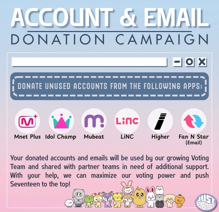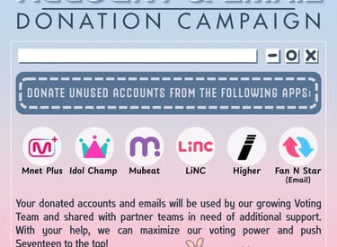 By donating unused accounts and emails (from apps like Mnet Plus, Mubeat, Idol Champ, etc.), you’re helping boost our voting power and assisting partner teams in need of extra support.